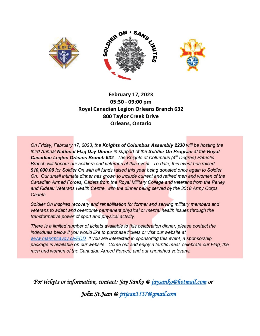 The Knights of Columbus 4th Degree is holding the 3rd Annual Flag Day Dinner on Friday the 17th of February from 5:30 – 900 pm at the Royal Canadian Legion Branch 632 Orleans (800 Taylor Creek Dr) All proceeds from the event will be donated to the Soldier On Program. Tickets for the event are $40.00 per person and can be purchased by contacting John St. Jean at jstjean3537@gmail.com