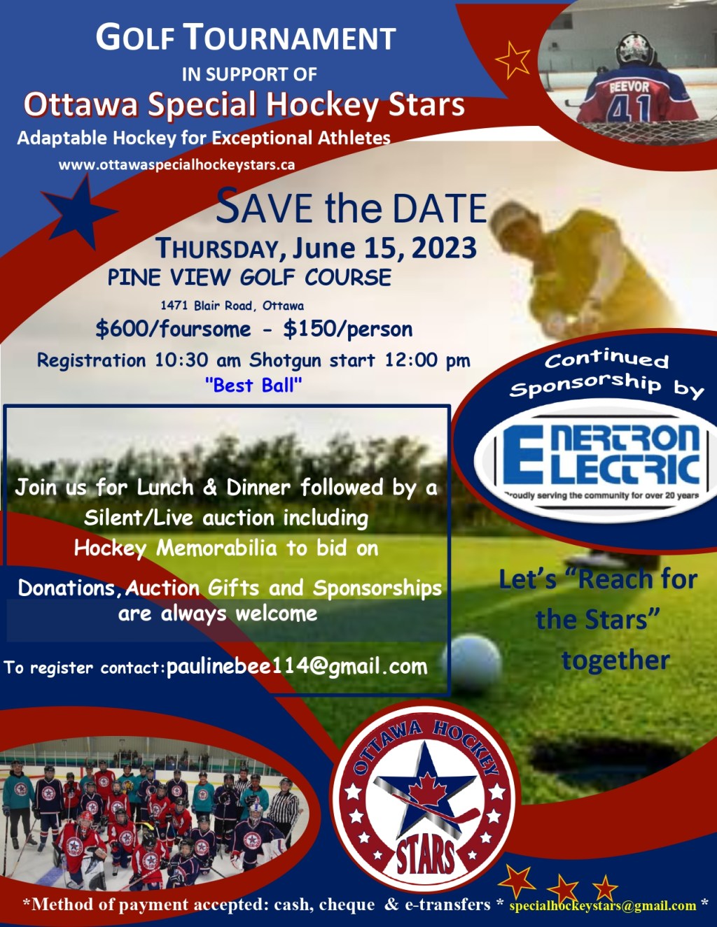The Ottawa Special Hockey Stars, we are a 100% volunteer Hockey team in the Ottawa area supporting youths & young adults with developmental challenges. Our Golf Tournament is being held at the Pineview Golf Course, 1471 Blair Road in the East end of Ottawa on Thursday June 15th 2023. The funds raised at this event allows our athletes to look and feel like their NHL idols, helps with the high costs of ice time, insurance & supplies them with hockey jerseys, pants and socks. They also experience off ice fun trips as a group, helps them create new friendships & gives them a very inclusive environment where they will always feel comfortable and have fun