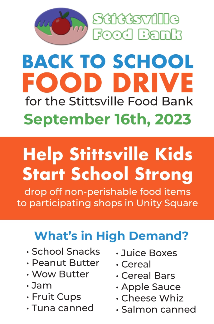 We are organizing a food drive for the Stittsville Food Bank (SFB) for September 16th at Unity Square in Stittsvile (corner of Hazeldean and Iber road) 10am – 2pm.