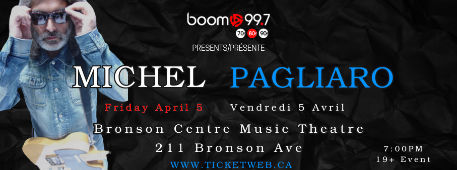 boom 99.7 Presents Michel Pagliaro Where Bronson Centre Music Theatre, 211 Bronson Avenue, Ottawa Map When Apr 05/24 07:00 PM - Apr 05/24 11:00 PM Age All