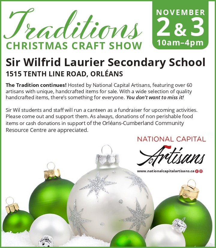 The Tradition continues! Hosted by National Capital Artisans, featuring over 60 artisans with unique, handcrafted items for sale. With a wide selection of quality handcrafted items, there’s something for everyone. You don’t want to miss it! Sir Wil students and staff will run a canteen as a fundraiser for upcoming activities. Please come out and support them. As always, donations of non perishable food items or cash donations in support of the Orléans-Cumberland Community Resource Centre are appreciated.