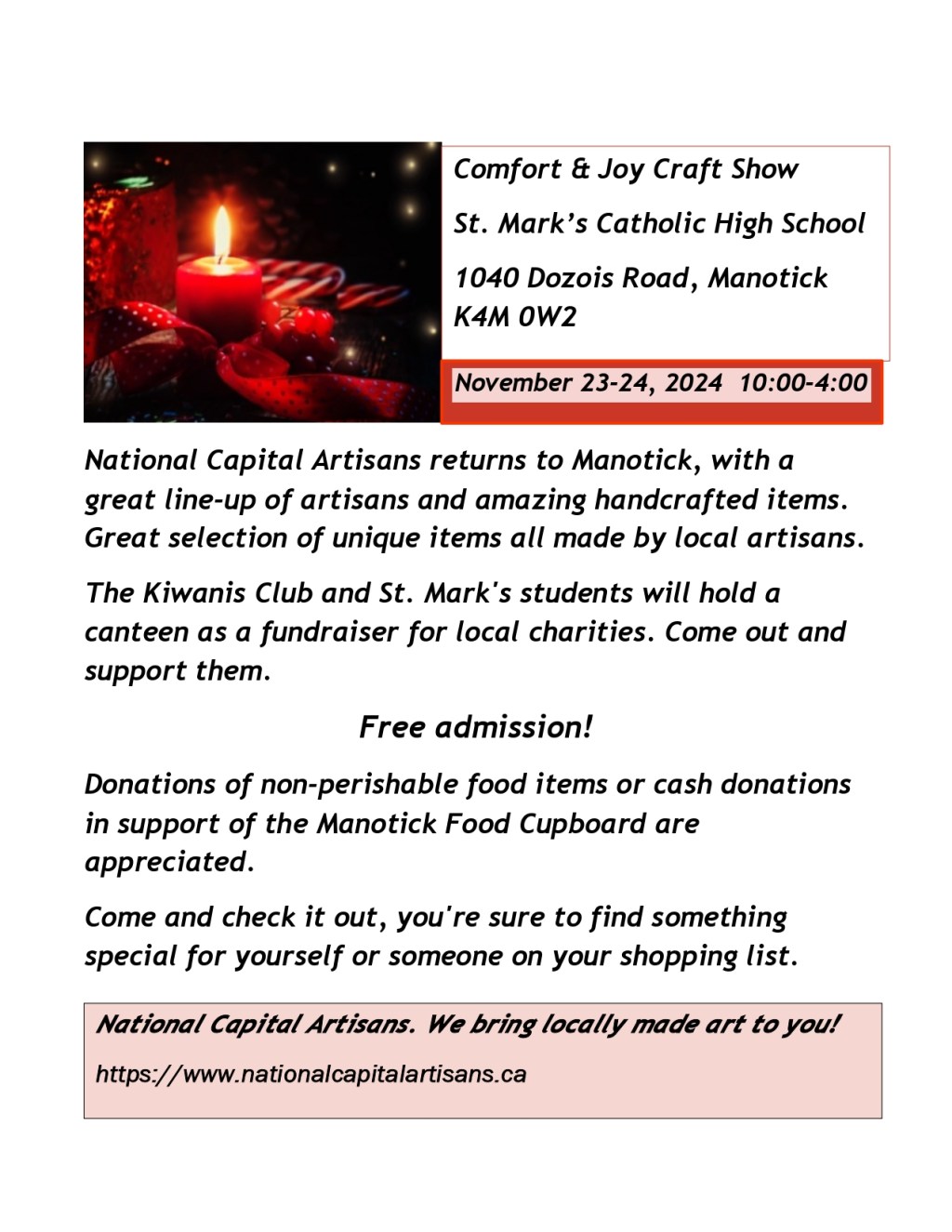 National Capital Artisans returns to Manotick, with a great line-up of artisans and amazing handcrafted items. Great selection of unique items all made by local artisans. The Kiwanis Club and St. Mark’s students will hold a canteen as a fundraiser for local charities. Come out and support them.