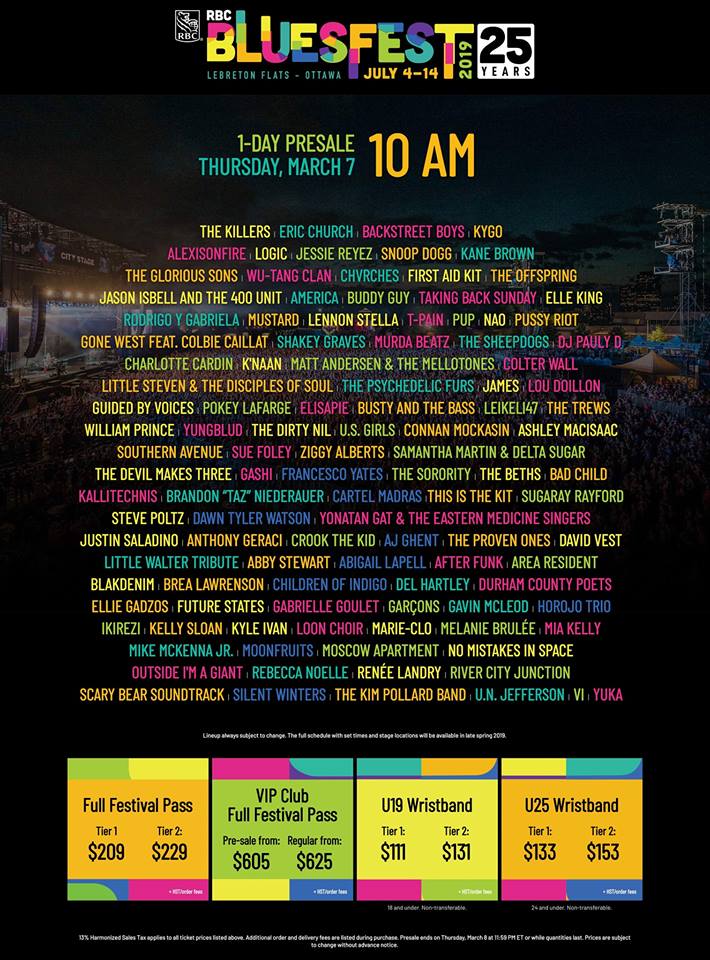 RBC Bluesfest Where Lebreton Flats, Ottawa Map When Jul 04/19 05:00 PM - Jul 14/19 11:00 PM Age All Website https://www.ottawabluesfest.ca/ RBC Bluesfest is from July 4 to July 14 at Lebreton Flats! Check out some of this year’s lineup: Backstreet Boys America http://www.youtube.com/watch?v=3oNULFXLuMc the Killers The Psychedelic Furs Eric Church