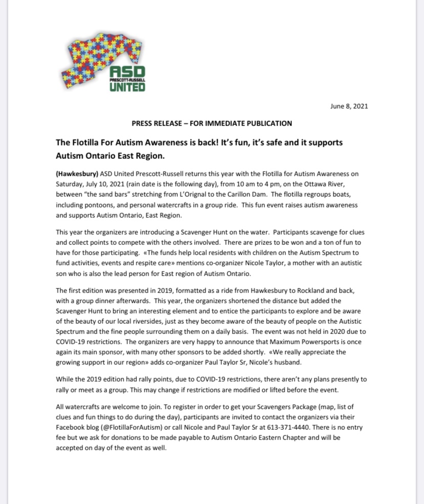 Flotilla for Autism Awareness When Jul 10/21 10:00 AM - Jul 10/21 04:00 PM Age All Website https://www.facebook.com/events/212073237425038/