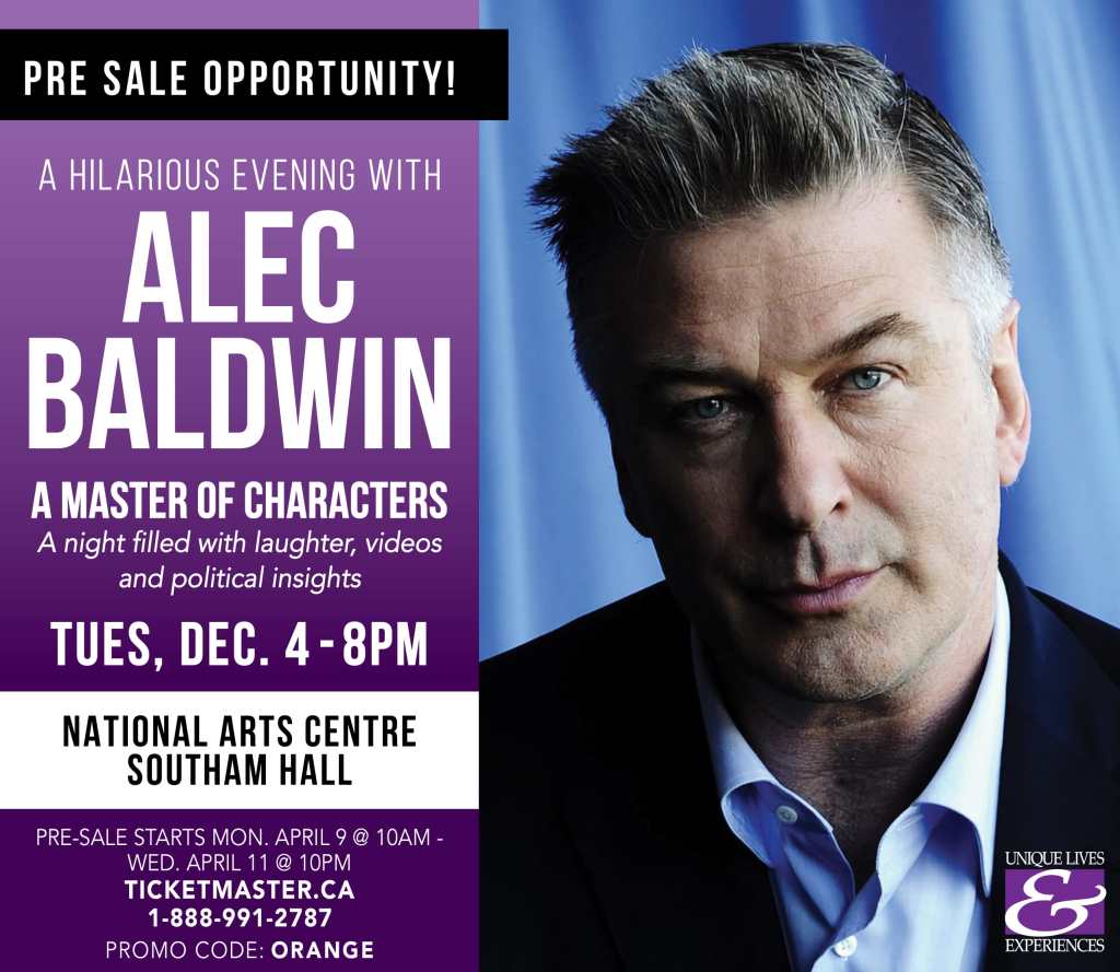 Master of characters Alec Baldwin is coming to National Arts Centre for a special evening filled with laughter, impersonations, video clips and political insights.