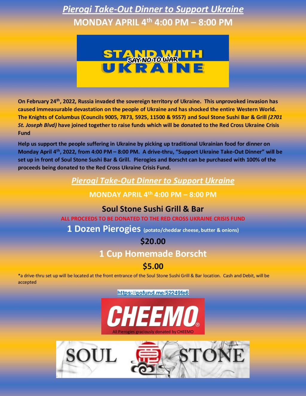 Pierogi Take-Out Dinner to Support Ukraine Where Soul Stone Sushi Bar & Grill , 2701, St. Joseph Blvd Map When Apr 04/22 04:00 PM - Apr 04/22 08:00 PM Age All Website https://gofund.me/52249fe6