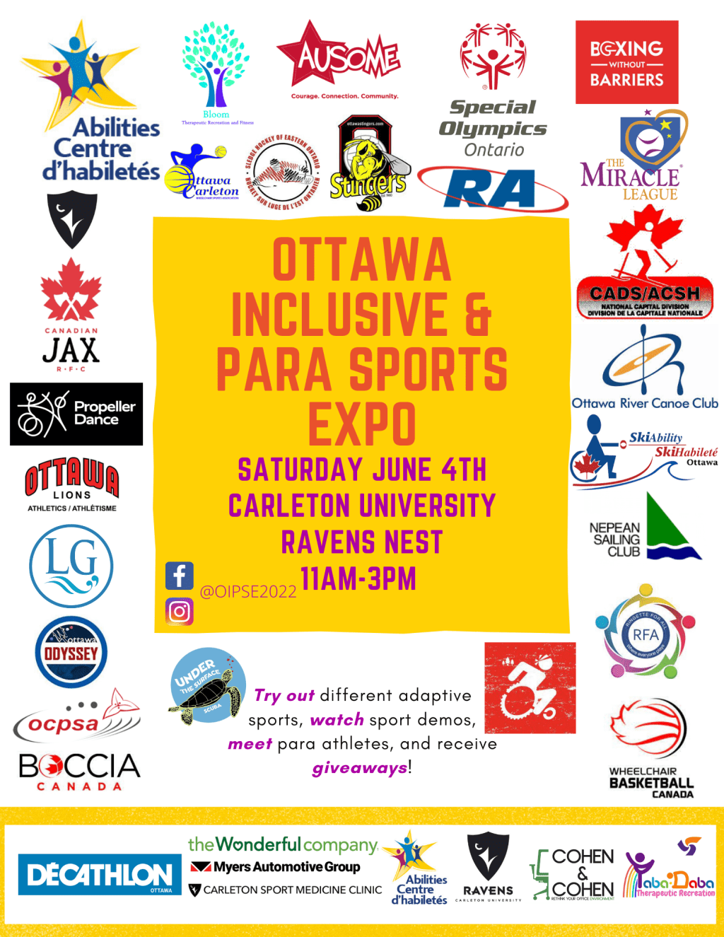 The Ottawa Inclusive & Para Sports Expo is a large community sporting event that will be held during National AccessAbility Week (NAAW) on Saturday June 4th at Carleton University in Ottawa. The event’s mission and vision is to bring together community and sports organizations providing inclusive and adaptive sport and recreation opportunities in the National Capital Region. This FREE event will provide children, youth, families, and adults with hands-on experiences to learn about and try multiple adapted and inclusive sports. Additionally, it will provide opportunities for engagement and recruitment for local organizations. Come try out different adaptive sports, watch sport demos, meet para athletes and receive giveaways!!