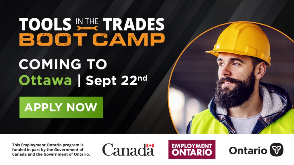 The Tools in the Trades Boot Camp is coming to Ottawa on September 22nd. This event is for adults not currently enrolled in full-time education and who are interested in the trades, and it’s FREE! Apply today! Spots are limited.