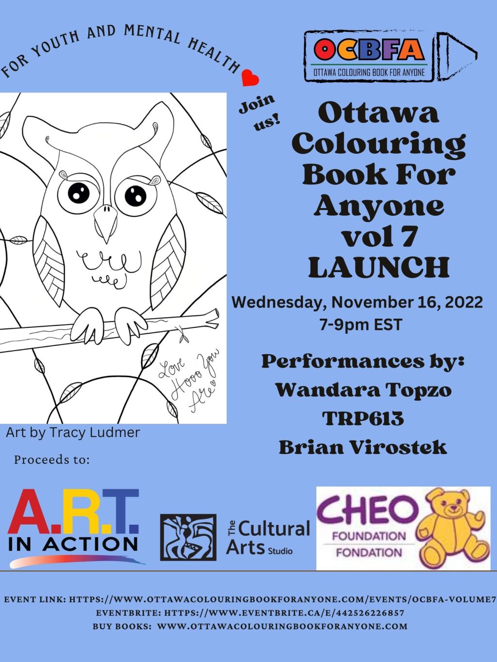 Local artists of all ages and abilities, with the help of The Ottawa Colouring Book for Anyone project, led by Christine Kumchy, have come together for the seventh year to create the Ottawa Colouring Book For Anyone, volume 7. The book launch will be held virtually on Wednesday, November 16 from 7-9pm. The project provides support to multiple causes related to youth, mental health and the arts, including CHEO, A.R.T. in Action Ottawa, and the Cultural Arts Studio. The launch content will include meeting some of the artists, listening to multiple wonderful live musicians, watching some live performance art, and getting to know the project, the artists, and the colouring book family.